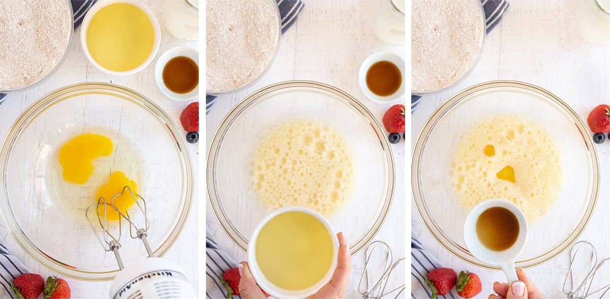 - Crack the eggs into a large mixing bowl and use an electric mixer to beat them until light and fluffy, about 1 or 2 minutes (until you see lots of air bubbles). Add the vegetable oil, sugar, and vanilla extract, and beat again to combine.