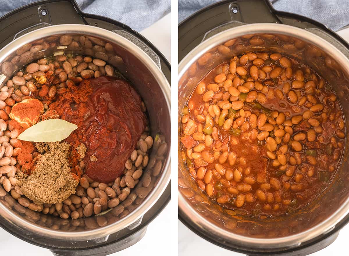 - Return the cooked beans to the Instant Pot along with 1 cup of water, ketchup, brown sugar, molasses, Dijon, smoked paprika, salt, pepper, and a bay leaf. Stir well and then pressure cook for an additional 10 minutes.