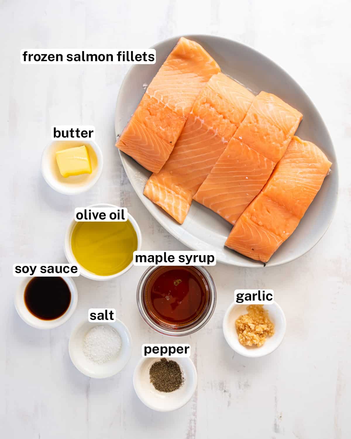 - Remove the salmon fillets from their packaging and rinse them with cold water to remove any icy glaze. Pat the salmon dry with paper towels and brush both sides of each fillet with olive oil. For the maple glaze, in a small bowl combine the pure maple syrup, reduced sodium soy sauce, minced garlic, melted butter, salt, and pepper.