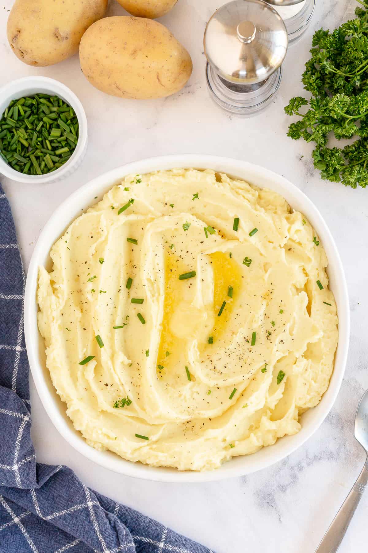 - Potatoes – Yukon Gold potatoes are my favorite choice for mashed potatoes. These all-purpose potatoes are waxy enough to hold up well to boiling but starchy enough to mash beautifully. Unlike the white, mealy flesh of the Russet potato, Yukon Gold potatoes have a creamy, smooth flesh with a naturally buttery flavor.