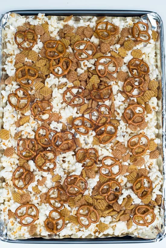 Line a large rimmed baking sheet with heavy duty foil and give it a light coat of non-stick cooking spray. Spread out one packet of popped Pop Secret, 3 cups of Crispix Cereal, and 1-1/2 cups of small twist pretzels.